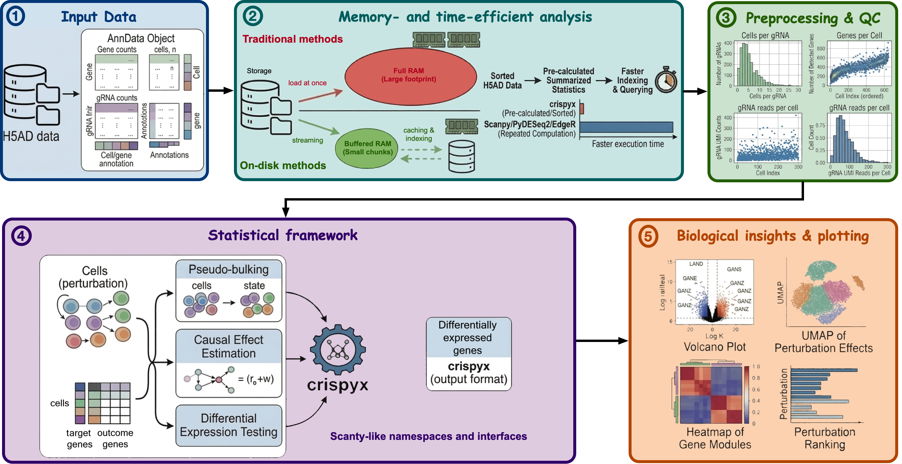 crispyx is a Python package for streamlining genome-wide CRISPR screen analysis. It streams data directly from on-disk AnnData (.h5ad) files, so quality control, normalization, pseudo-bulk aggregation, and differential expression all run without loading the full count matrix into memory — enabling analysis of even the largest screens on commodity hardware.